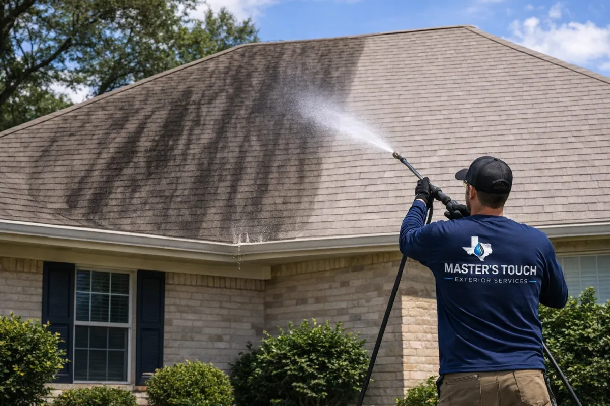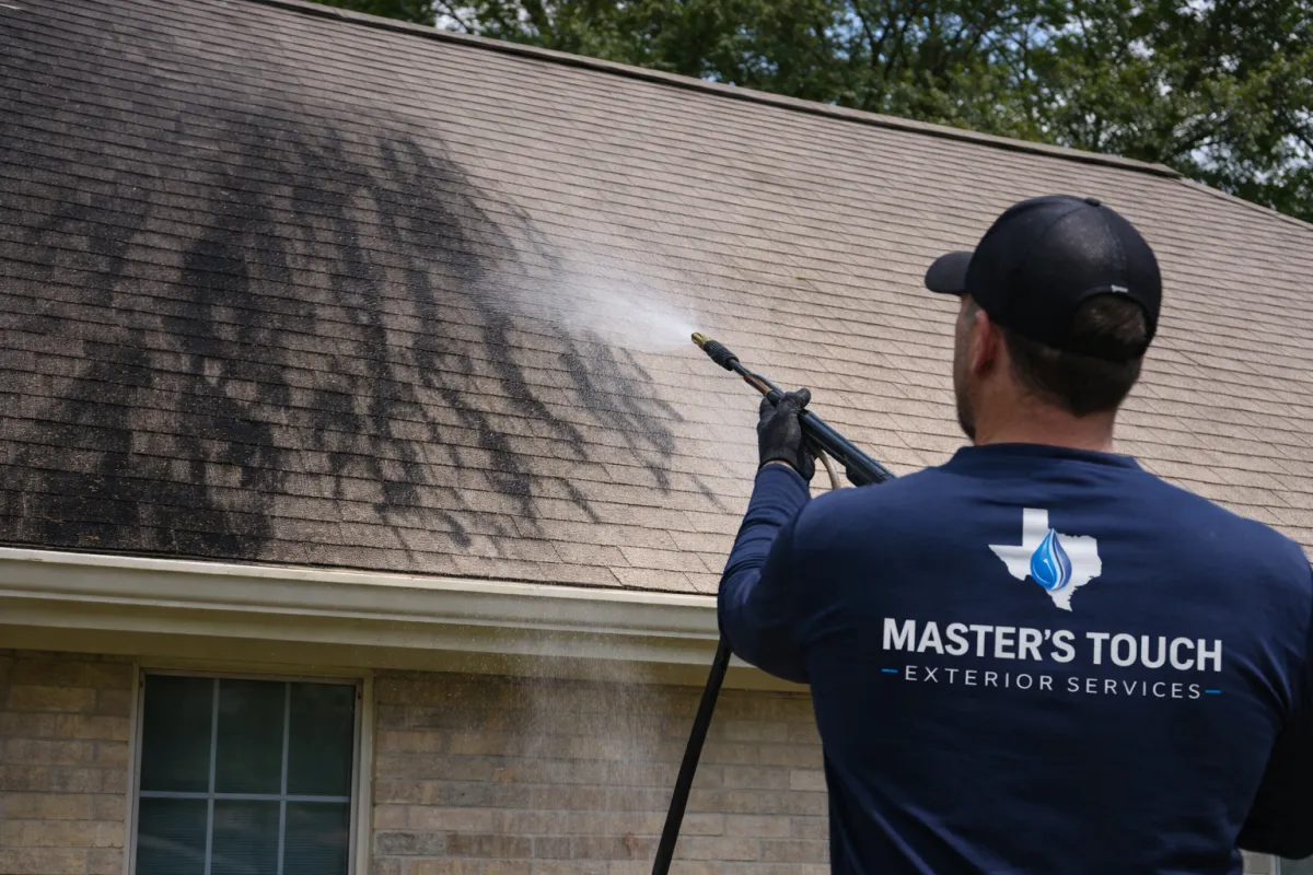 At Master's Touch, we use a professional soft washing process designed to kill the algae at the source and restore the appearance of your roof safely - without the high-pressure cleaning that can damage shingles.